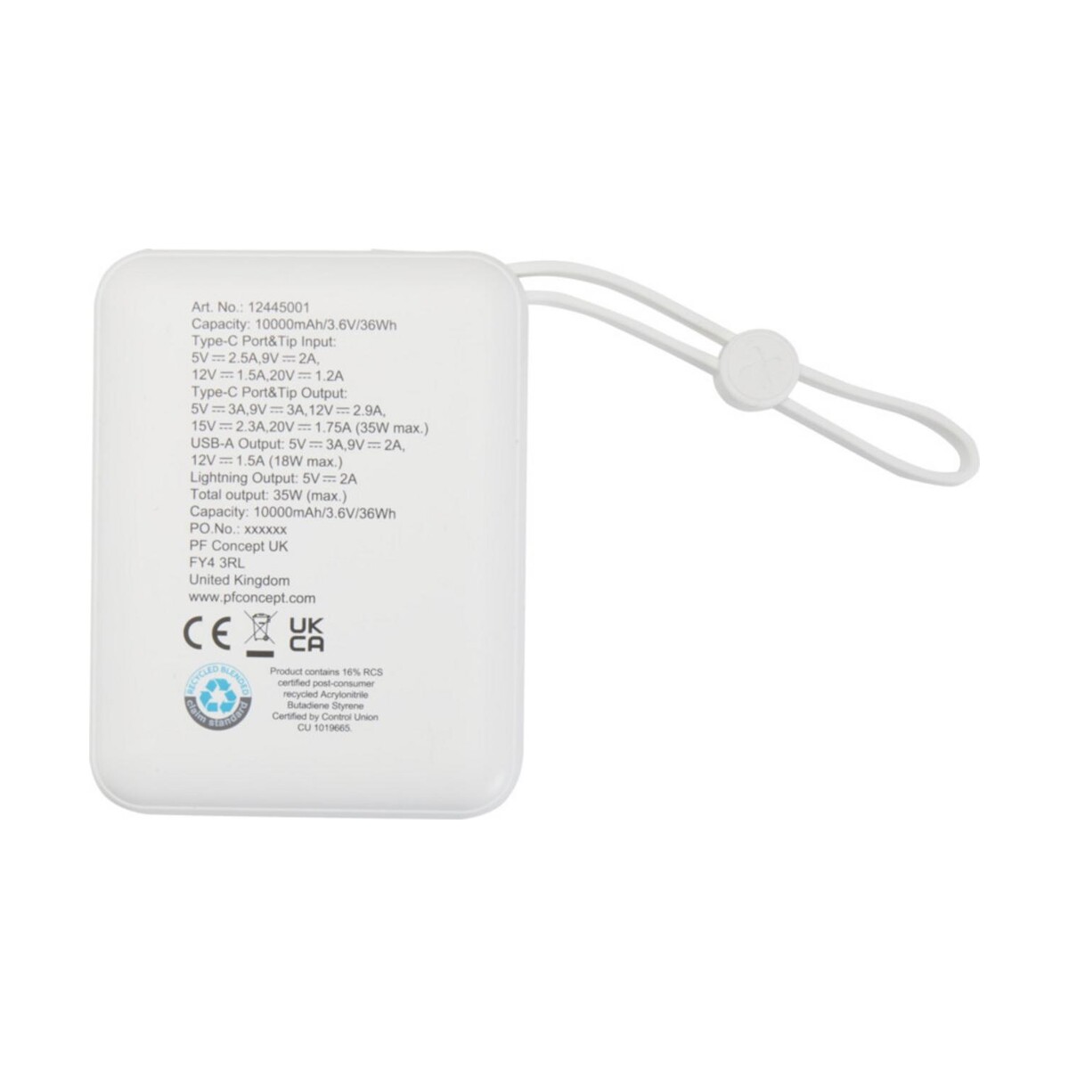 Acrux powerbank do tabletu o pojemności 10 000 mAh i mocy 35 W z wbudowanym kablem typu C – wykonany z tworzyw sztucznych pochodzących z recyklingu.