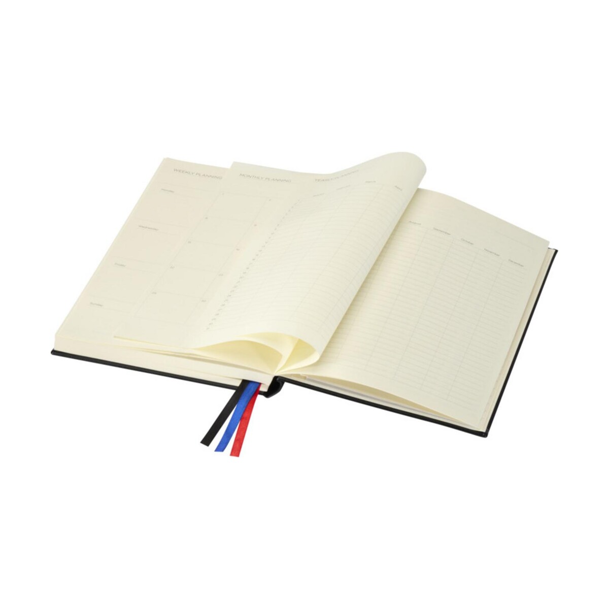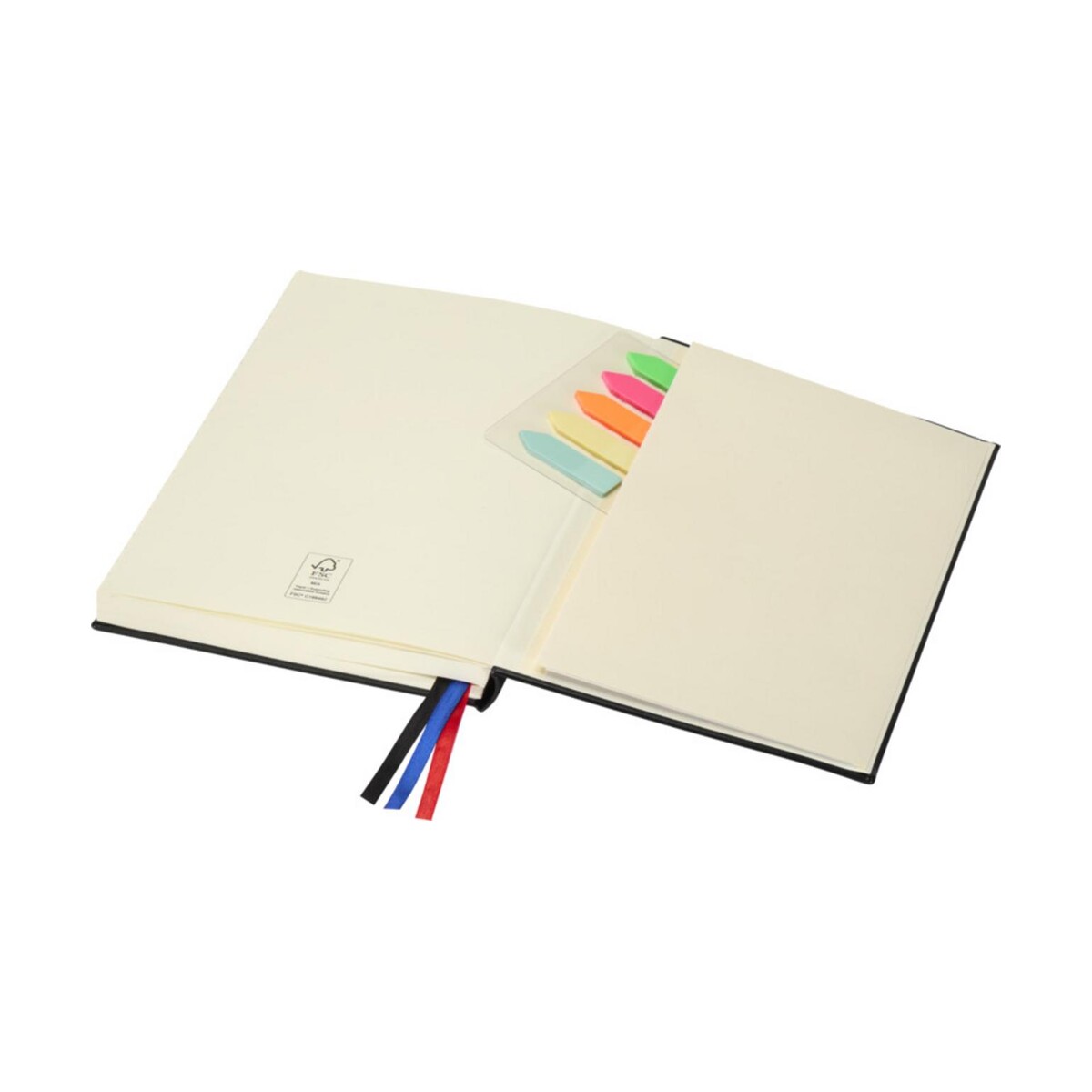 Twarda okładka w klasycznej czerni skrywa dwie solidne gumki, trzy wstążkowe zakładki w kontrastowych kolorach oraz praktyczną kieszonkę na luźne notatki. W komplecie znajdziesz także 200 kolorowych karteczek samoprzylepnych, które ułatwią kategoryzację pomysłów. Całość mieści się w kompaktowych wymiarach 21,5 × Ø 15,3 cm i waży zaledwie 605 g, co sprawia, że notatnik bez trudu zmieści się w aktówce czy plecaku.