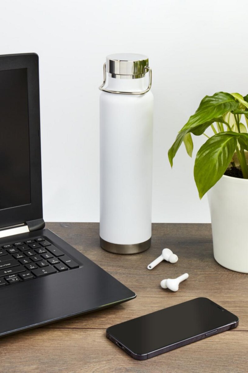 Astra butelka ze stali nierdzewnej z recyklingu z miedzianą izolacją próżniową o pojemności 650 ml, posiadająca certyfikat RCS to znakomity, przyjazny środowisku gadżet, który łączy w sobie design premium z troską o planetę 🌿. Dzięki podwójnym ściankom i miedzianej próżni utrzymuje temperaturę napojów nawet do 12 h w przypadku ciepłych oraz 24 h przy zimnych, co sprawia, że sprawdzi się podczas górskich wypraw, treningów, w biurze czy w podróży służbowej. Szeroki otwór ułatwia napełnianie kostkami lodu, a zakręcana pokrywka z pętlą ze stali nierdzewnej ułatwia przenoszenie.