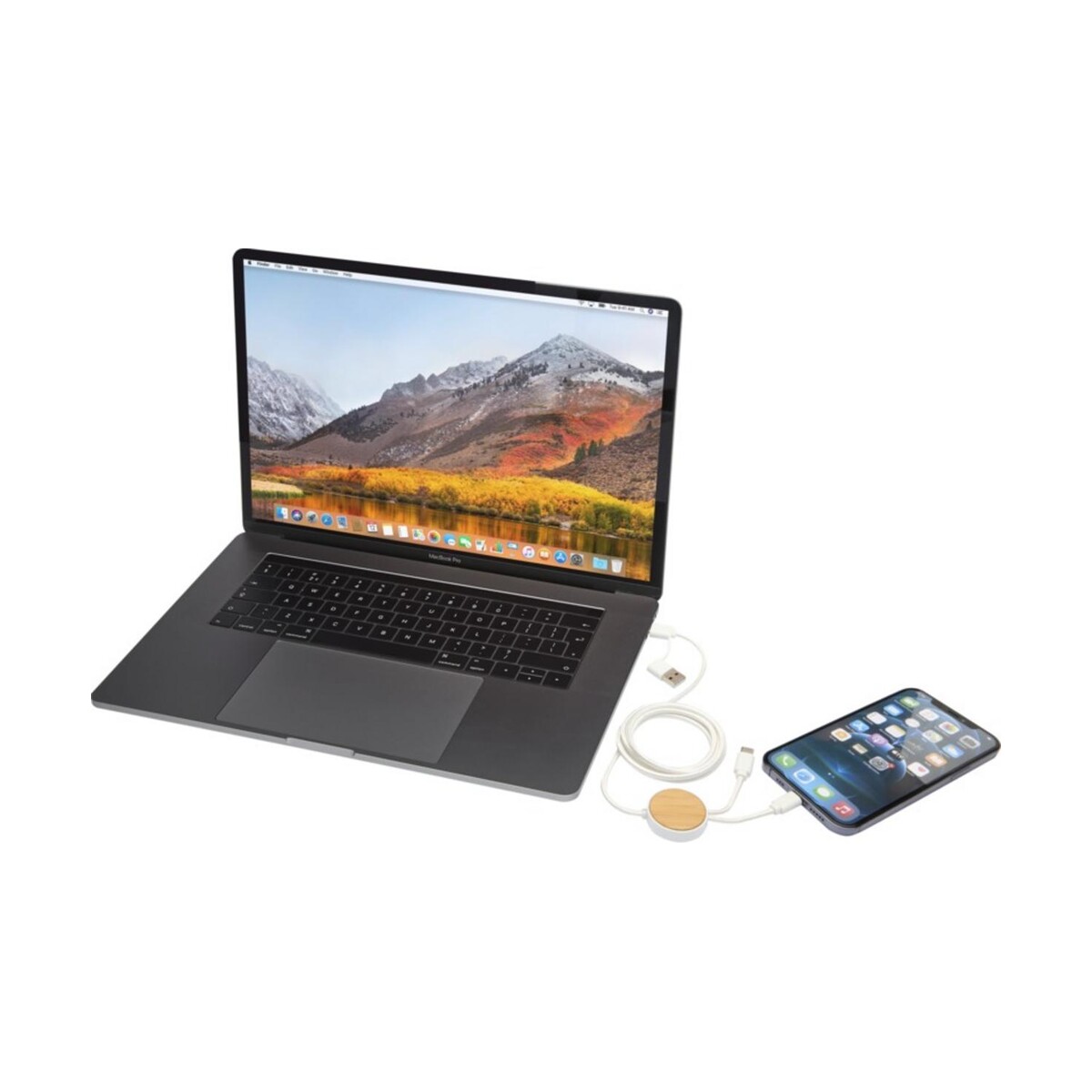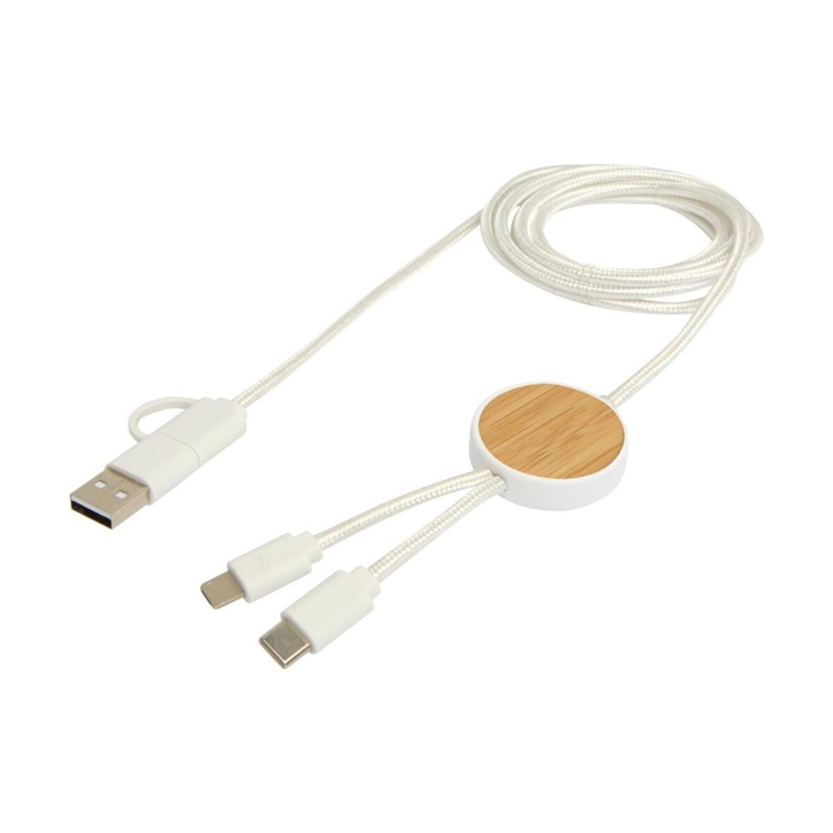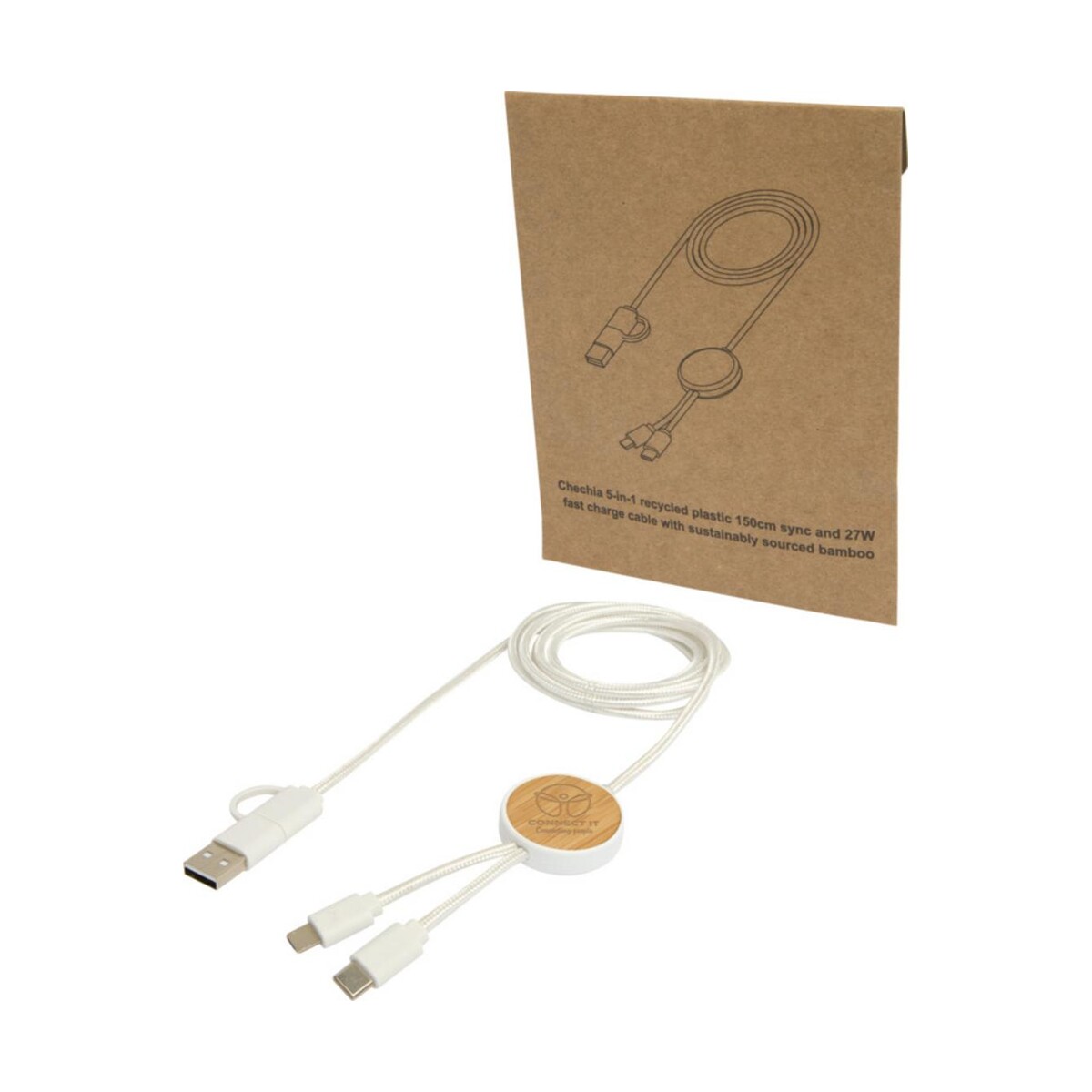 Chechia kabel do synchronizacji danych i szybkiego ładowania 5 w 1 27 W o długości 150 cm z tworzyw sztucznych pochodzących z recyklingu z detalami z bambusa to znakomity wybór dla aktywnych użytkowników smartfonów, tabletów i powerbanków, a także kierowców korzystających z nawigacji w aucie. W biurze umożliwi podłączenie różnych sprzętów bez plątaniny przewodów, a w domu posłuży jako uniwersalny przewód do wszystkich rodzinnych urządzeń. Dzięki trwałej konstrukcji i przyjaznym materiałom zmniejsza ślad węglowy, oferując jednocześnie maksimum wygody. Wybierz ten kabel, jeśli szukasz produktu o wysokiej jakości, który będzie efektownym i użytecznym prezentem reklamowym, gotowym promować markę na co dzień.