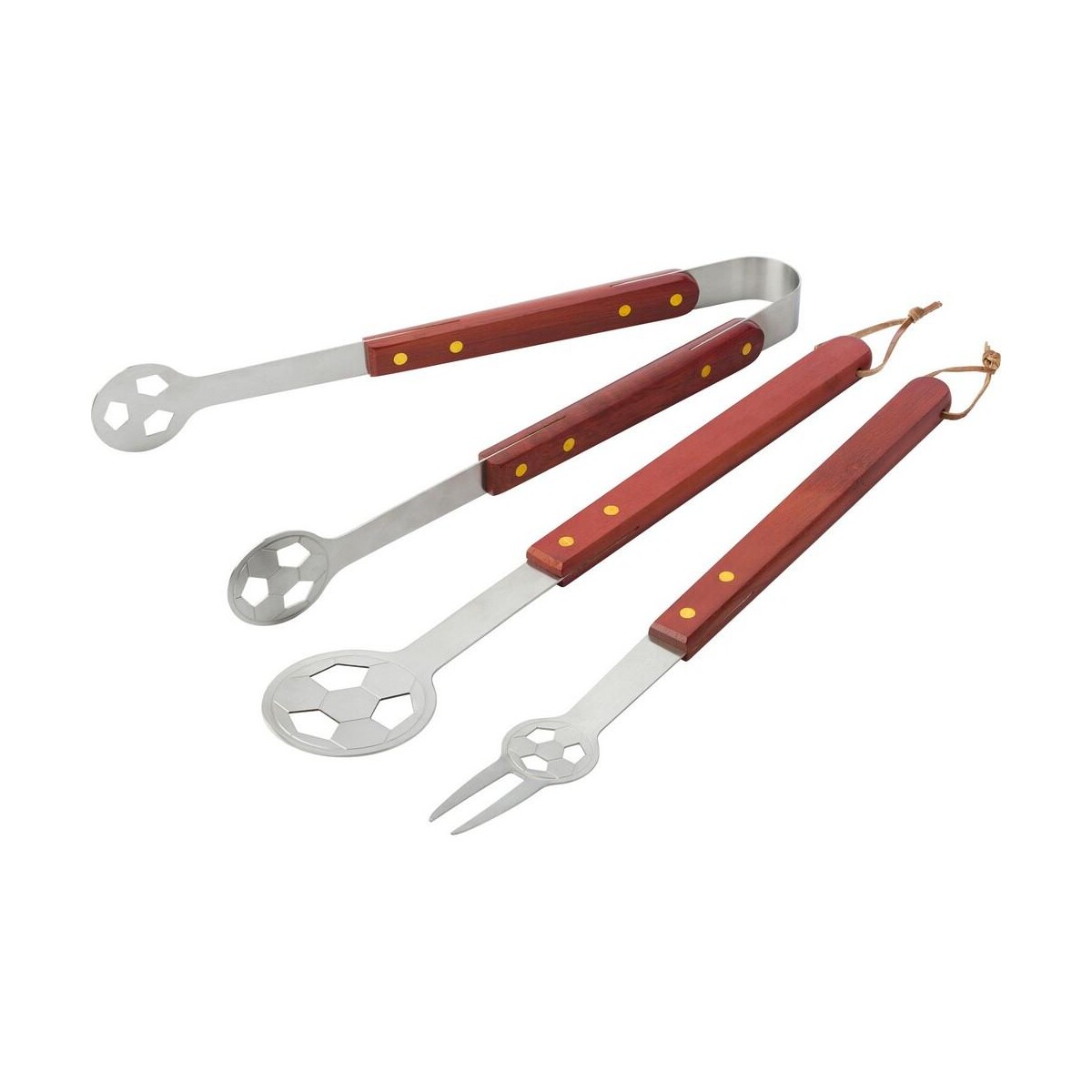 Fartuch, zestaw do grilla „piłka nożna”, 3 el. to znakomity sposób, aby połączyć sportowe emocje z radością wspólnego grillowania. W komplecie znajdziesz trzy solidne narzędzia: łopatkę, widelec oraz szczypce ze stali nierdzewnej, każde z drewnianą rączką ozdobioną wyciętym motywem futbolowej piłki. Akcesoria skrywa zielony fartuch o wymiarach 78 × 42 × 1,5 cm, wykonany z mieszanki bawełny, PU oraz wytrzymałego nylonu 600D, a całość waży jedynie 578 g – dzięki temu łatwo zabierzesz zestaw na działkę, plażę czy piknik. ⚽️
