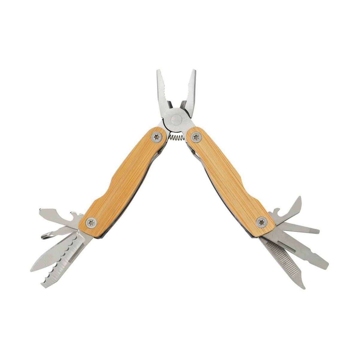 Długość zaledwie 6,9 cm i szerokość 3,29 cm sprawiają, że ten kieszonkowy pomocnik zmieści się w każdej torbie, plecaku, a nawet kieszeni. Mimo niewielkich rozmiarów oferuje aż 12 funkcji, w tym: nóż, otwieracz do butelek, śrubokręt płaski i krzyżakowy, nożyczki, pilnik, korkociąg, szydło, klucz oczkowy, piłkę do drewna oraz kółko do kluczy. Wszystkie narzędzia zostały wykonane ze stali nierdzewnej, a bambusowa obudowa nadaje produktowi przyjazny środowisku charakter.