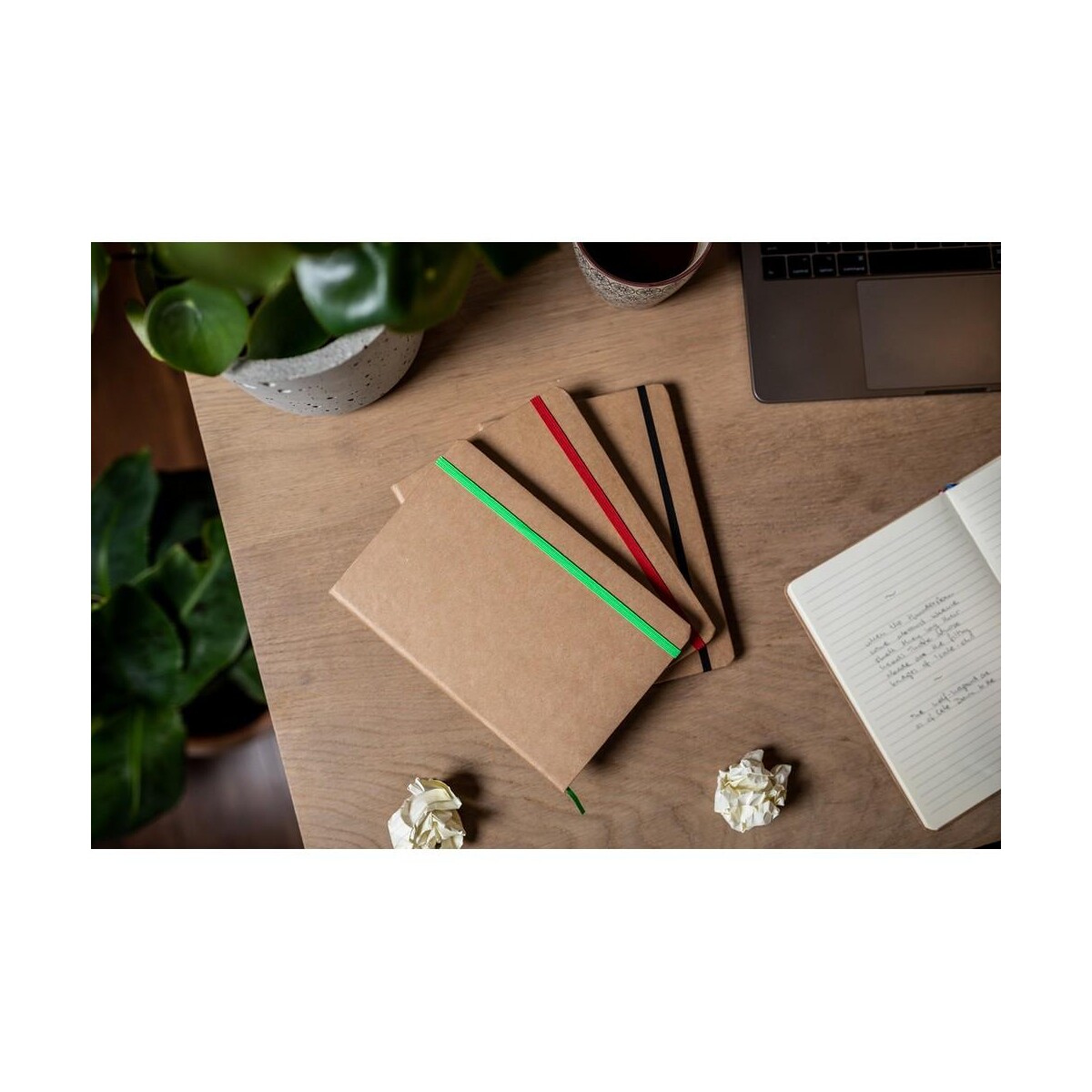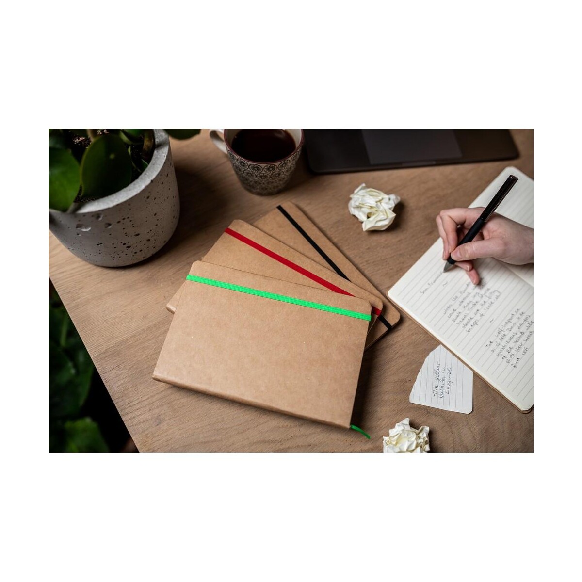 Notatnik ok. A5 | Joshua to doskonały towarzysz codziennej pracy oraz wyjątkowy gadżet reklamowy 😊. Wykonany z kartonu z recyklingu i wypełniony 96 kremowymi kartkami w linie (aż 192 strony) o gramaturze 70 g/m2, łączy w sobie troskę o środowisko z wysoką funkcjonalnością. Twarda, ekologiczna okładka w czterech eleganckich kolorach – czerwonym, czarnym, granatowym i jasnozielonym – chroni zapiski podczas transportu, a elastyczna opaska zapobiega przypadkowemu otwarciu. Wbudowana tasiemka zakładkowa pozwala szybko odnaleźć ważne notatki. Poręczny format 21 x 14,3 cm i waga jedynie 260 g sprawiają, że zmieści się w każdej torbie czy plecaku.