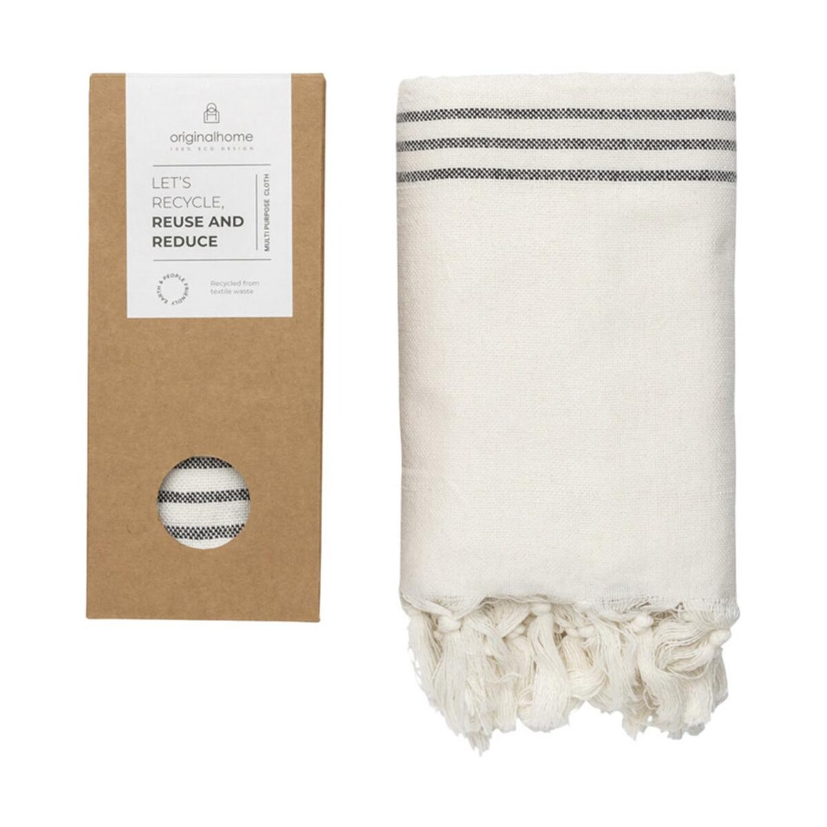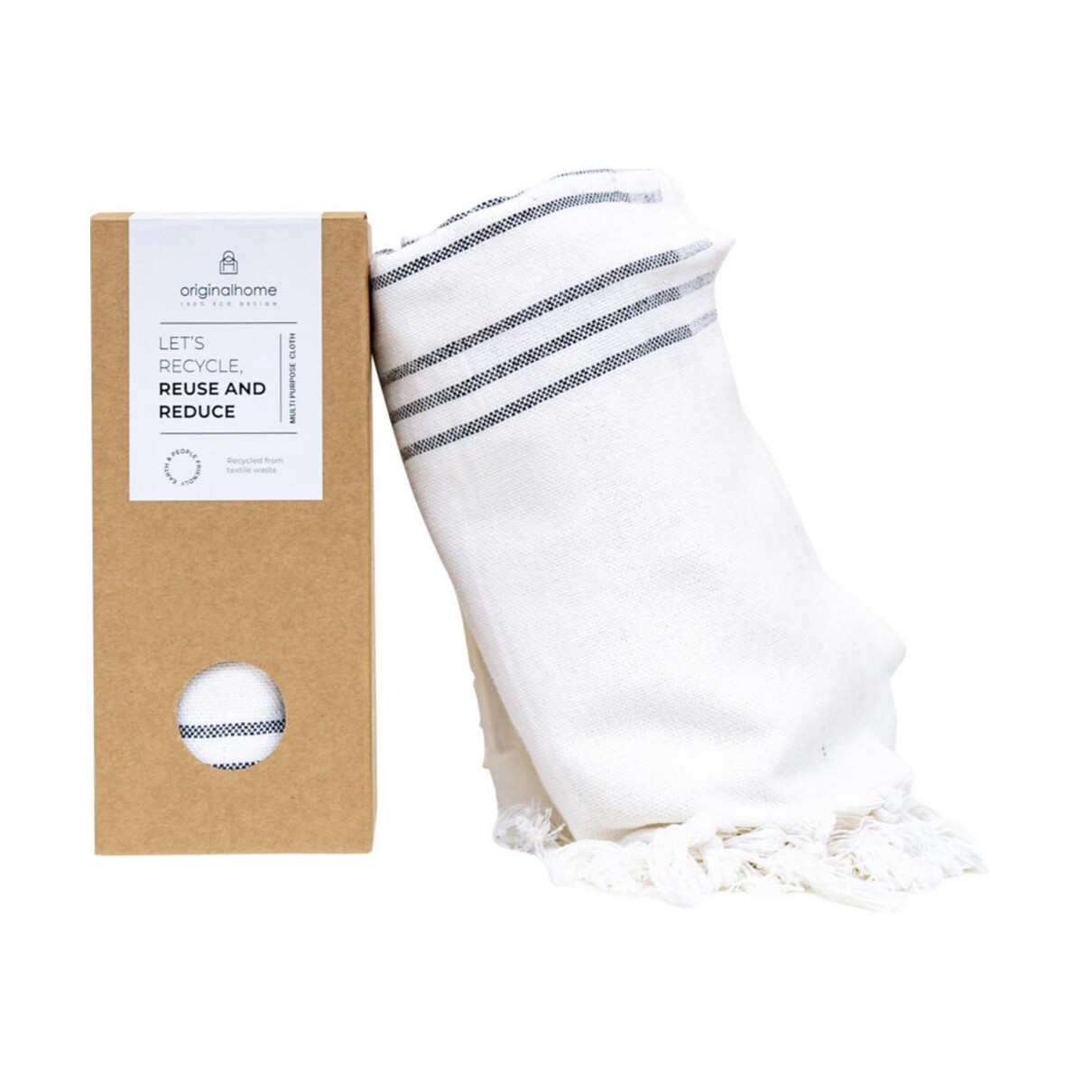 Originalhome tkanina z recyklingu — 85 x 175 cm to wszechstronny gadżet, który łączy w sobie funkcjonalność pledu, ręcznika, chusty i szalika. Uszyty ręcznie z przędzy pozyskanej w 100 % z odpadów branży odzieżowej, waży zaledwie 370 g, a przy wymiarach 85 × 175 cm jest wystarczająco kompaktowy, by zmieścić się w torbie podróżnej czy plecaku. Tkany na tradycyjnym krośnie wspiera przedsiębiorczość kobiet w Bangladeszu i świetnie wpisuje się w politykę CSR. Dzięki mieszance 70 % bawełny, 25 % poliestru i 5 % innych włókien z recyklingu wyróżnia się miękkością oraz trwałością.