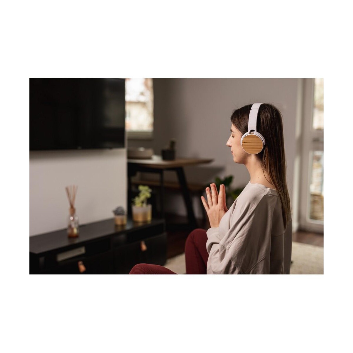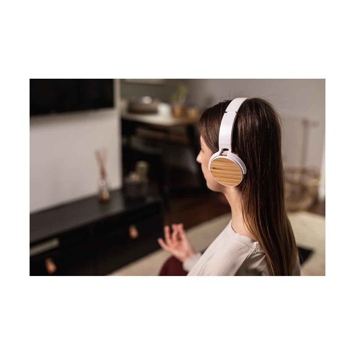 Składane bezprzewodowe słuchawki nauszne, bambusowe elementy | Hollie to znakomity wybór, gdy poszukujesz ekoproduktu, który połączy nowoczesną technologię z naturalnym akcentem. Połączenie białego tworzywa PP oraz stylowych, całkowicie biodegradowalnych wstawek z bambusa przyciąga wzrok i od razu buduje pozytywne skojarzenia z ekologią. Ze względu na niewielkie wymiary 17,5 x 20,5 x 9 cm i funkcję składania sprzęt mieści się w każdym plecaku lub torbie, a wbudowany moduł BT 5.0 gwarantuje stabilne połączenie w promieniu do 10 m. 😊