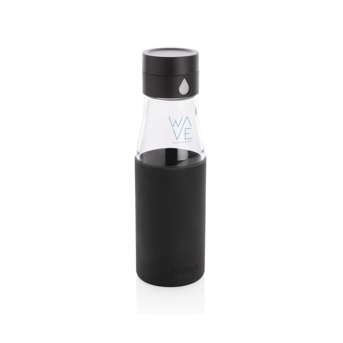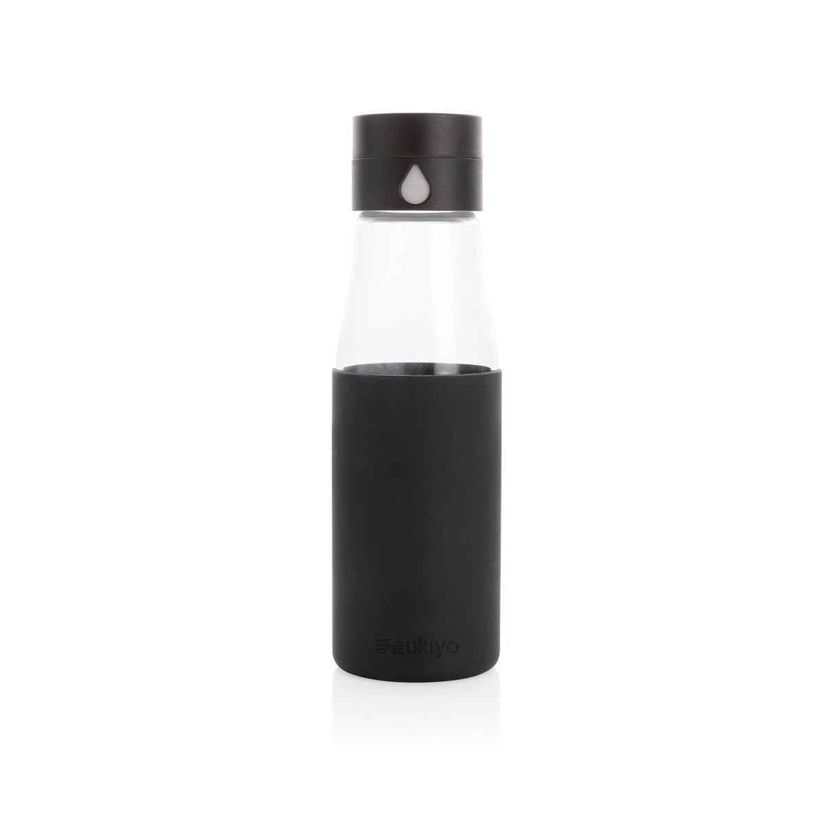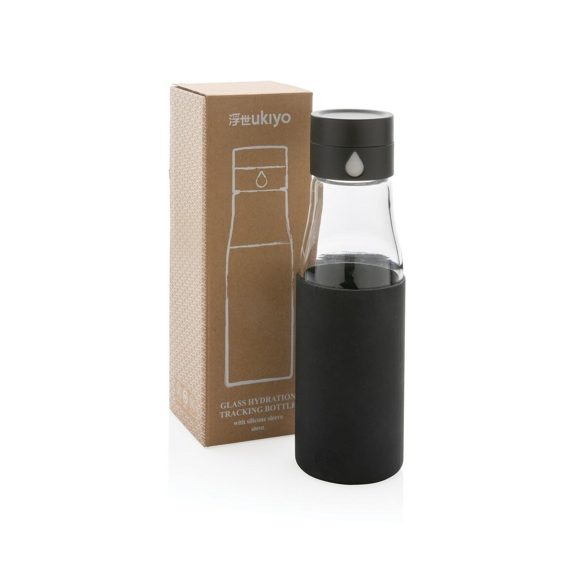 Szklana butelka 650 ml Ukiyo, monitorująca ilość wypitej wody ma pojemność 650 ml, jest w pełni szczelna, a jej korpus można myć w zmywarce, choć zakrętkę zaleca się myć ręcznie. Wymiary 7 x 5,5 x 23,5 cm sprawiają, że butelka mieści się w większości uchwytów samochodowych i kieszeni plecaków. Silikonowa opaska dostępna w kolorach niebieskim, czarnym lub szarym zapobiega wyślizgnięciu się z dłoni. Niski ślad węglowy 1,45 kg CO2 oraz wzór zastrzeżony® podkreślają jej proekologiczny i ekskluzywny charakter.