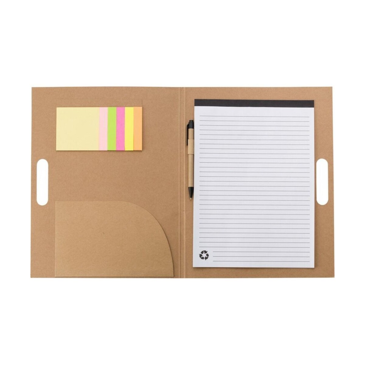 Teczka konferencyjna ok. A4 z notatnikiem, karteczki samoprzylepne, długopis to znakomite, ekologiczne rozwiązanie, które łączy w sobie funkcjonalność i troskę o środowisko 🌿. Wykonana z połączenia materiał: abs, karton 600 g/m2, papier 70 g/m2 w naturalnym, beżowym kolorze, przyciąga uwagę subtelną elegancją i nowoczesnym designem. Dzięki kompaktowym wymiary: 26 x 33 x 1 cm oraz niewielkiej waga: 282 g, bez trudu zmieścisz ją w torbie czy plecaku, zabierając na spotkania, szkolenia lub targi branżowe.