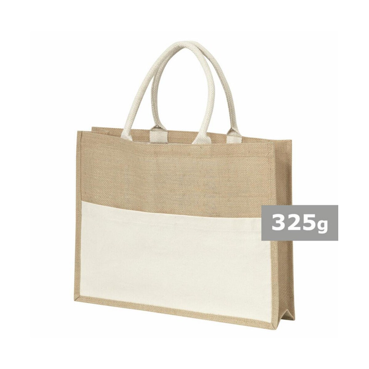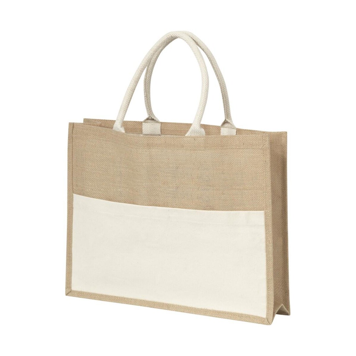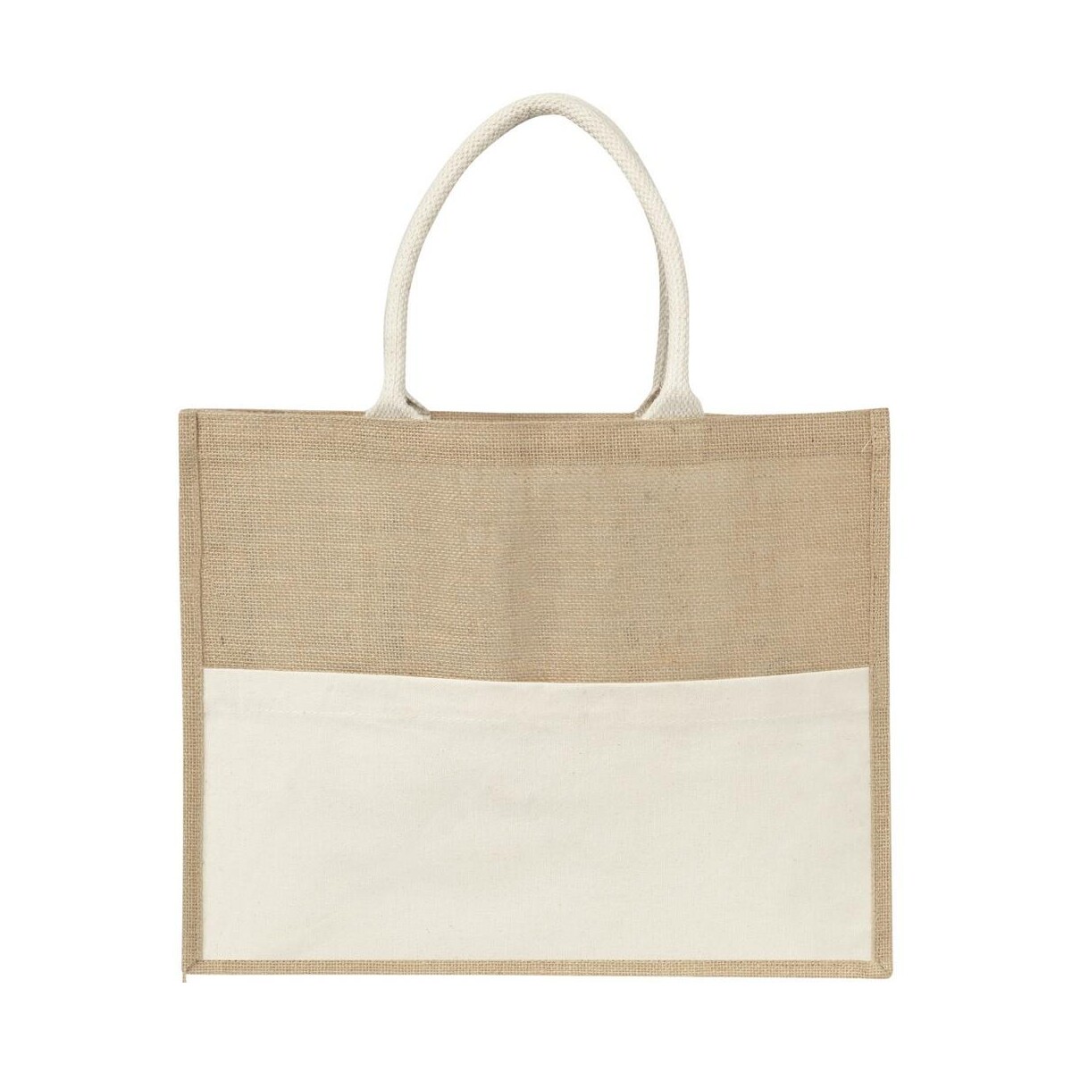 Torba z juty to ekologiczny hit, który wyróżni Twoją markę podczas każdej kampanii. Wykonana z naturalnej juty o gramaturze 325 g/m² oraz bawełny, łączy w sobie wytrzymałość i przyjazność środowisku. Wymiary 40 × 16 × 35 cm i obszerne dno z plastikowym usztywnieniem sprawiają, że zmieści spore zakupy, ręcznik plażowy czy materiały konferencyjne. Jej lekka waga 284 g pozwala swobodnie nosić ją każdego dnia, a miękkie uchwyty dbają o komfort dłoni. Z przodu znajduje się praktyczna kieszeń, idealna na telefon lub notes. Dzięki stonowanemu, naturalnemu kolorowi torba świetnie komponuje się z każdym strojem i podkreśla świadomość ekologiczną użytkownika 🌿.