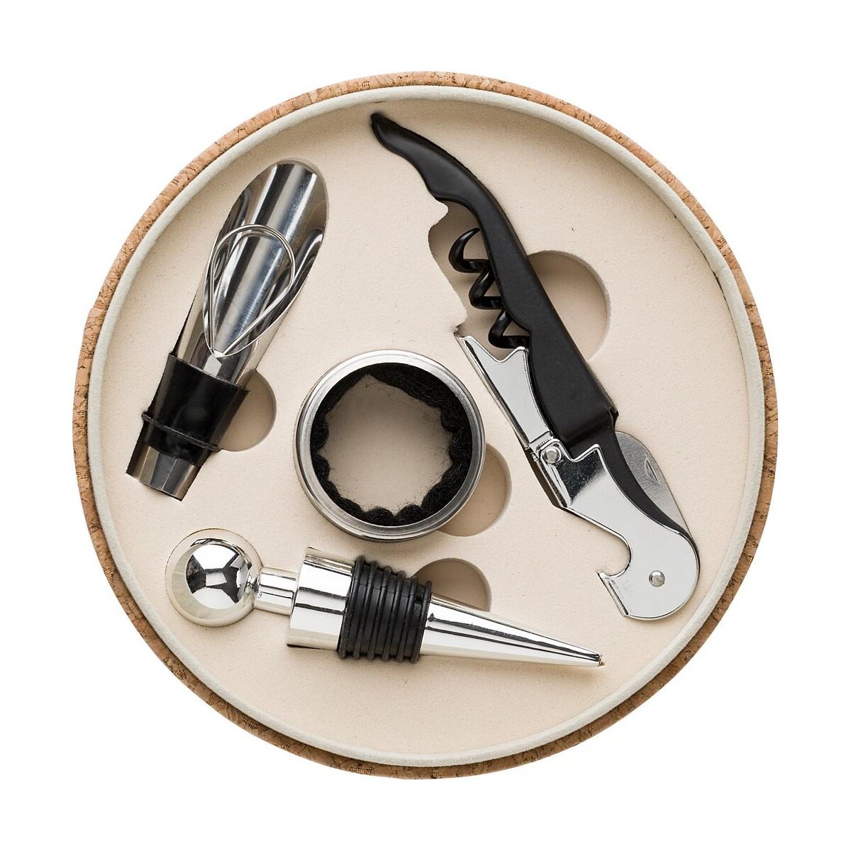 Zestaw do wina, 4 el. to ekologiczny gadżet, który przenosi kulturę degustacji trunków na wyższy poziom. Zamknięty w stylowym pudełku z naturalnego korka o wymiarach Ø16,5 x 4,5 cm i wadze zaledwie 291 g, zachwyca estetyką i przyjaznym środowisku pochodzeniem. W komplecie znajduje się niezawodny nóż kelnerski, pierścień chroniący przed kapaniem, szczelna zatyczka oraz nalewak z elastycznego silikonu – wszystko wykonane z połączenia korka, plastiku i trwałej stali nierdzewnej. Dzięki temu produkt jest nie tylko praktyczny, lecz także długowieczny 😊.
