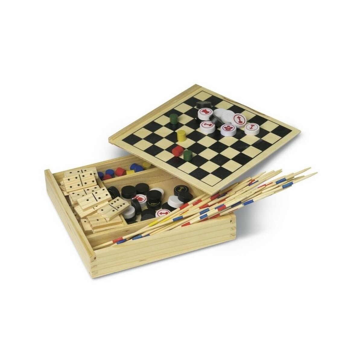 Zestaw gier to ponadczasowa kolekcja pięciu klasycznych zabaw zamknięta w stylowym, drewnianym pudełku. Domino, mikado, szachy, warcaby oraz „Chińczyk” tworzą komplet, który przyciąga uwagę zarówno dorosłych, jak i dzieci 😊. Naturalne drewno w połączeniu z dyskretnymi elementami z plastiku sprawia, że całość wpisuje się w trend gier ekologicznych, świetnie pasujących na plażę lub piknik. Dzięki kompaktowym Wymiarom: 17 x 16 x 3 cm i niewielkiej Wadze: 198 g możesz zabrać go wszędzie – na firmowy event, wyjazd integracyjny czy rodzinny urlop.