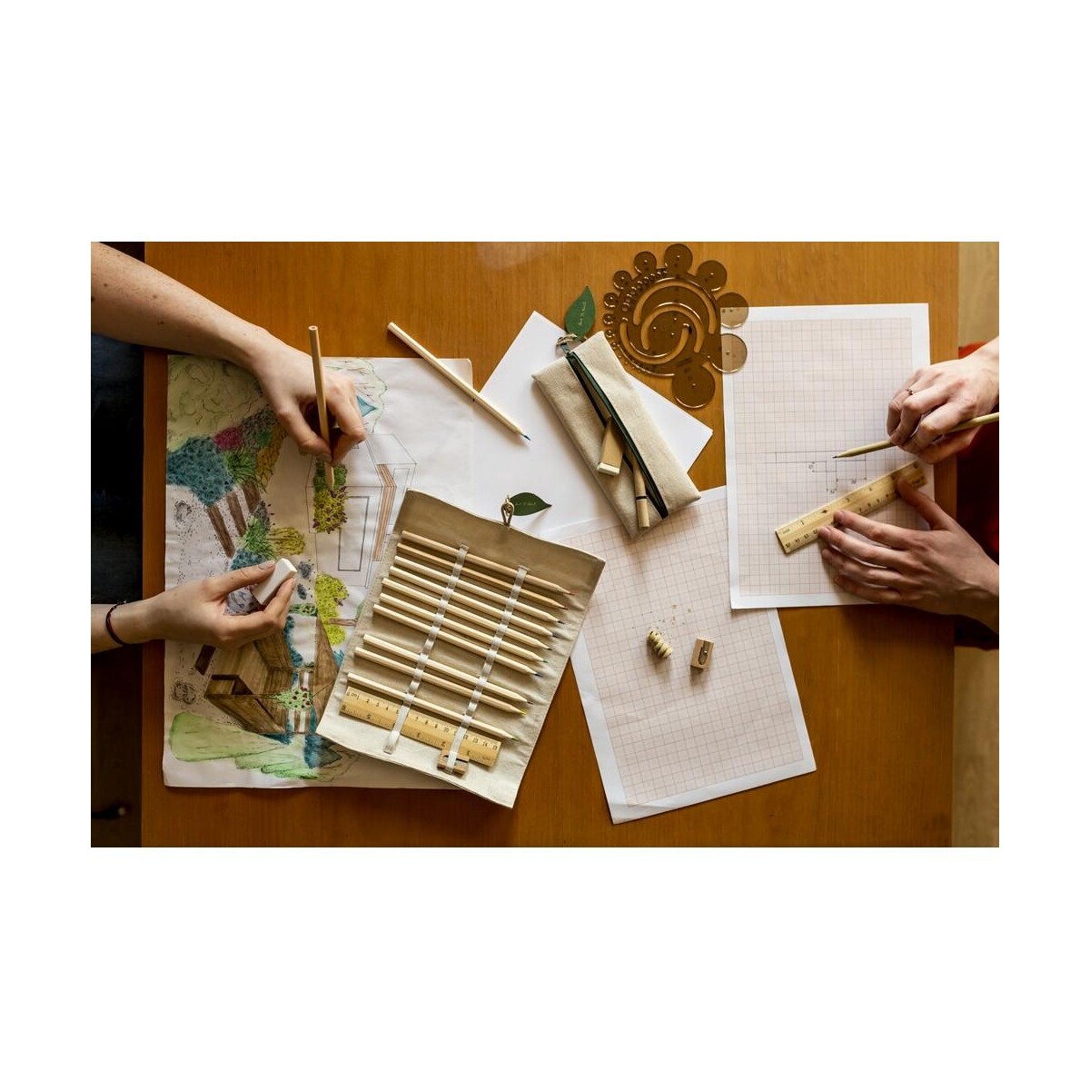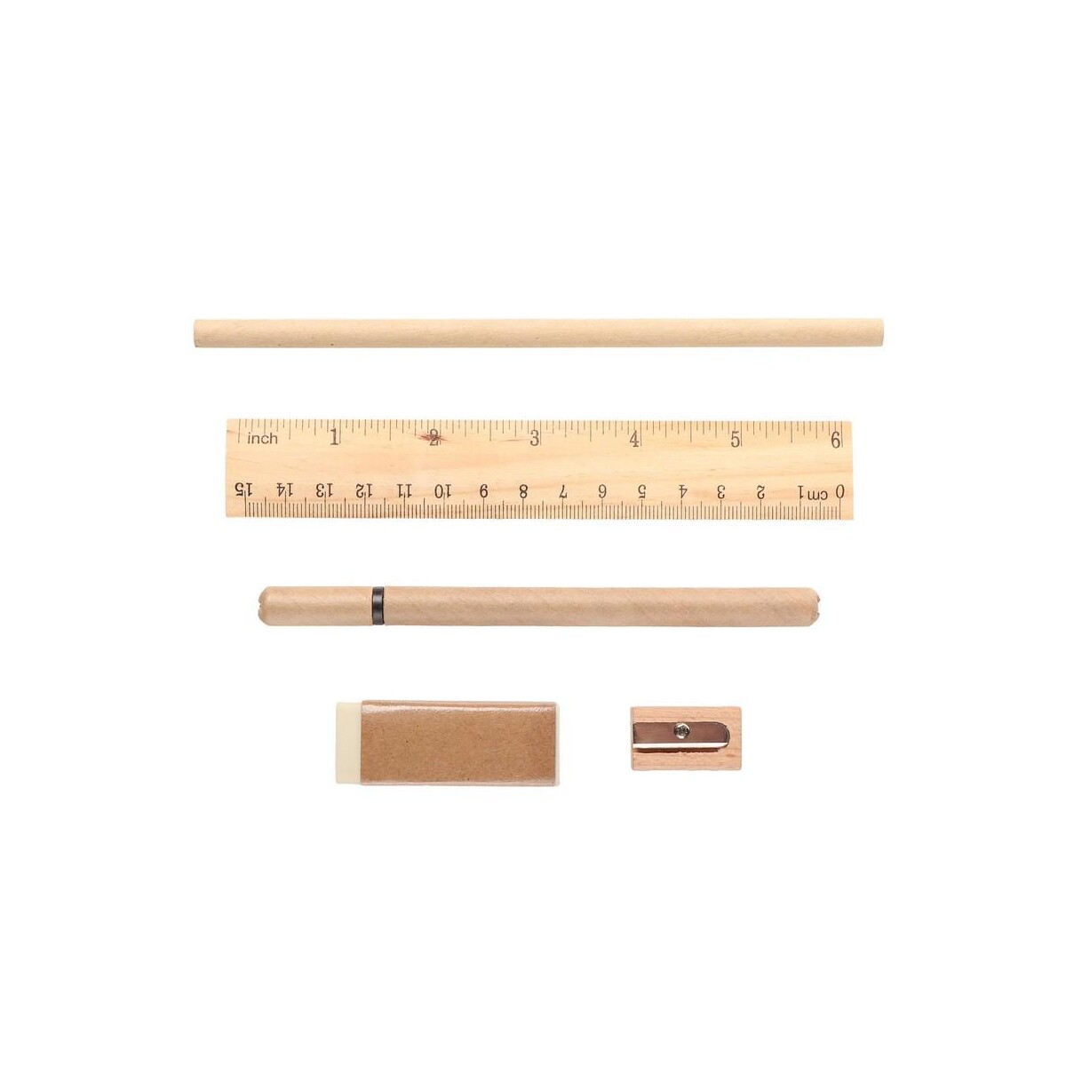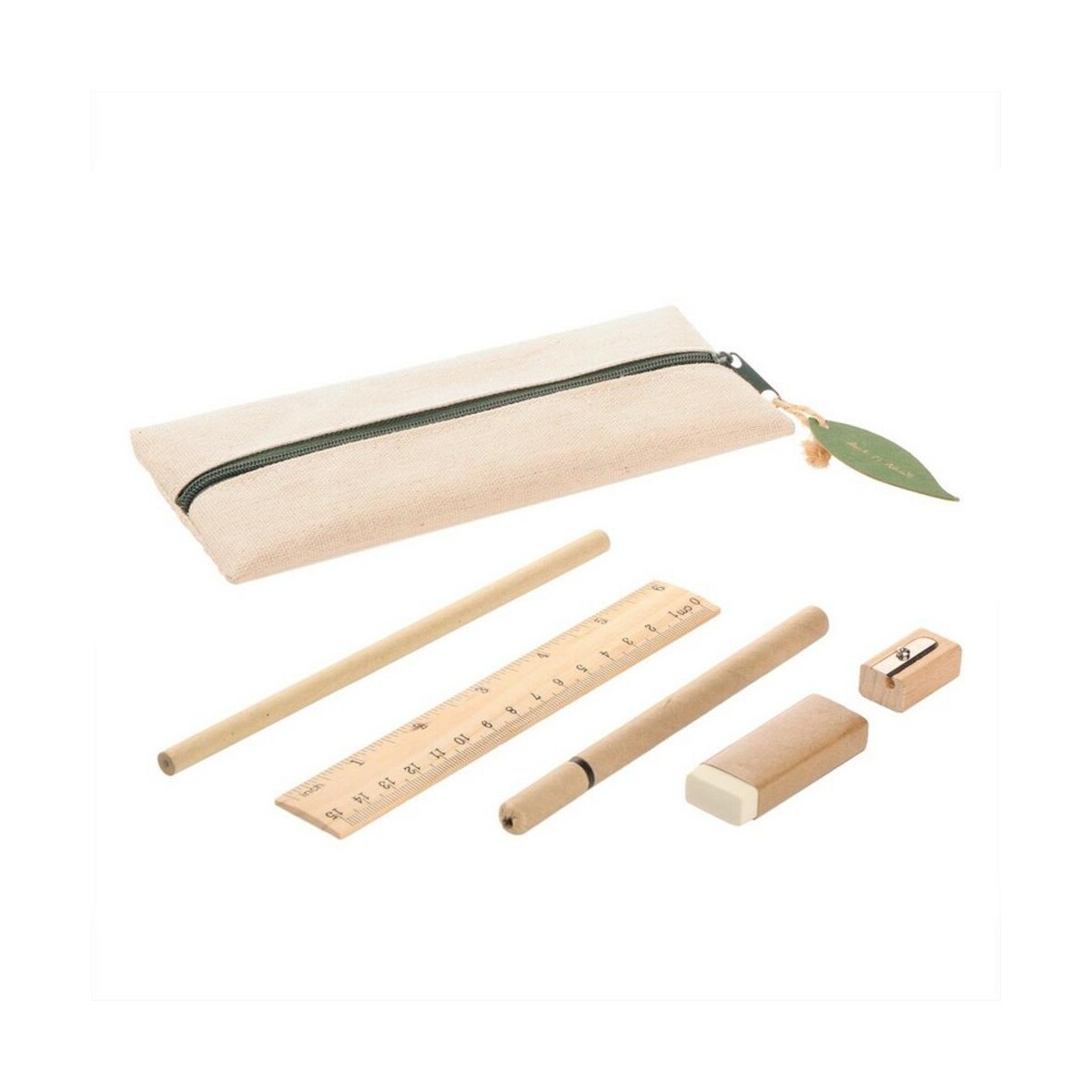 Komplet składa się z nieostrzonego ołówka, długopisu z niebieskim wkładem, linijki 15 cm / 6 cali, gumki oraz temperówki – wszystkie te elementy wykonano z naturalnych materiałów, takich jak bawełna, drewno i papier. Dzięki temu produkt wpisuje się w aktualne trendy zero waste i stanowi znakomity wybór dla marek promujących odpowiedzialność społeczną. Na każdym elemencie można umieścić logo lub precyzyjny nadruk, co czyni zestaw świetnym nośnikiem treści reklamowych.